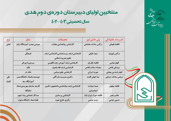 خانم فلاحیان معاون پرورشی دبیرستان، ضمن تشکر از اولیای شرکتکننده در انتخابات انجمن اولیا و مربیان، نتایج انتخابات را به شرح زیر اعلام کرد: