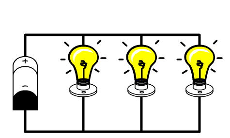 زمانی که بخواهید قطب مثبت و منفی را به هر دو لامپ وصل کنید، هر لامپ جداگانه به دو سر باتری وصل می شود و نور کم تری به چشم می خورد. به این ترتیب جریان برق هم زمان به هر دو لامپ وارد می ود، در این صورت لامپ ها به صورت موازی بسته شده اند. شکل زیر یک مدار موازی را نشان می دهد.
