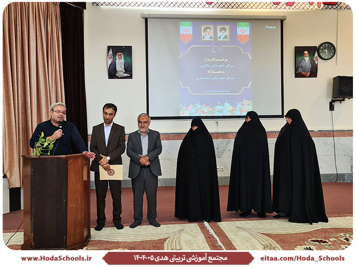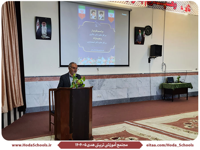 سپس آقای قزاقی، معاون اداره آموزش و پرورش ناحیهی 4 استان قم، ضمن تبریک هفتهی دفاع مقدس و آغاز سال تحصیلی جدید در هفتهی آینده، دربارهی نتایج آموزشی درخشان دبیرستان علوم و معارف اسلامی هدی در کل کشور صحبت کرد و مرهون زحمات مدیر و کادر و معلمان آموزشگاه دانست و دبیران را به ادامهی این مسیر و ارتقای آموزشی دبیرستان توصیه کرد. ایشان در ادامه از زحمات خانم شاکری تشکر کرده و از انتخاب خانم اسفندیاری، به عنوان مدیر جدید دبیرستان علوم و معارف اسلامی اعلام رضایت نموده و در پایان از زحمات خانم موسیپور نیز تشکر نمود.