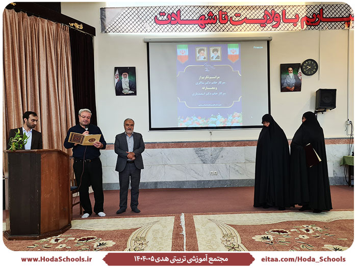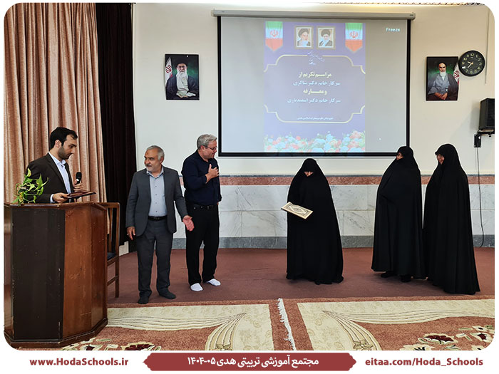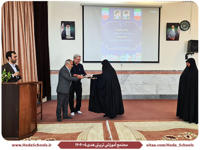 در پایان مراسم با اهدای لوح تقدیر و هدیه از زحمات خانم شاکری و خانم موسیپور قدردانی و آقای قزاقی، حکم خانم اسفندیاری به عنوان مدیر جدید دبیرستان علوم و معارف اسلامی را قرائت نموده، به ایشان تقدیم کرد.