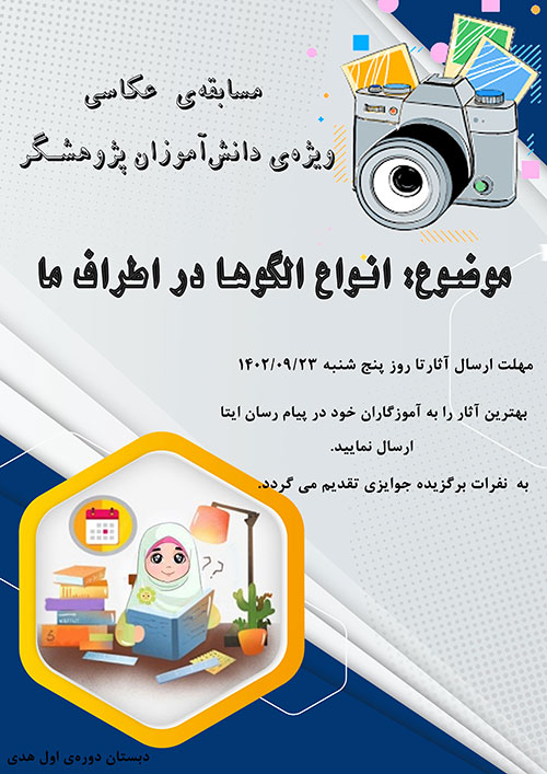 به مناسبت آغاز هفتهی پژوهشوفناوری دبستان دورهی اول هدی، مسابقهی عکاسی با موضوع " انواع الگوها در محیط اطراف ما " را برگزار مینماید. دانشآموزان پژوهشگر باید عکسهای گرفته شده را برای آموزگاران خود در پیامرسان ایتا ارسال نمایند. به نفرات برتر هدایایی اهدا خواهد شد.