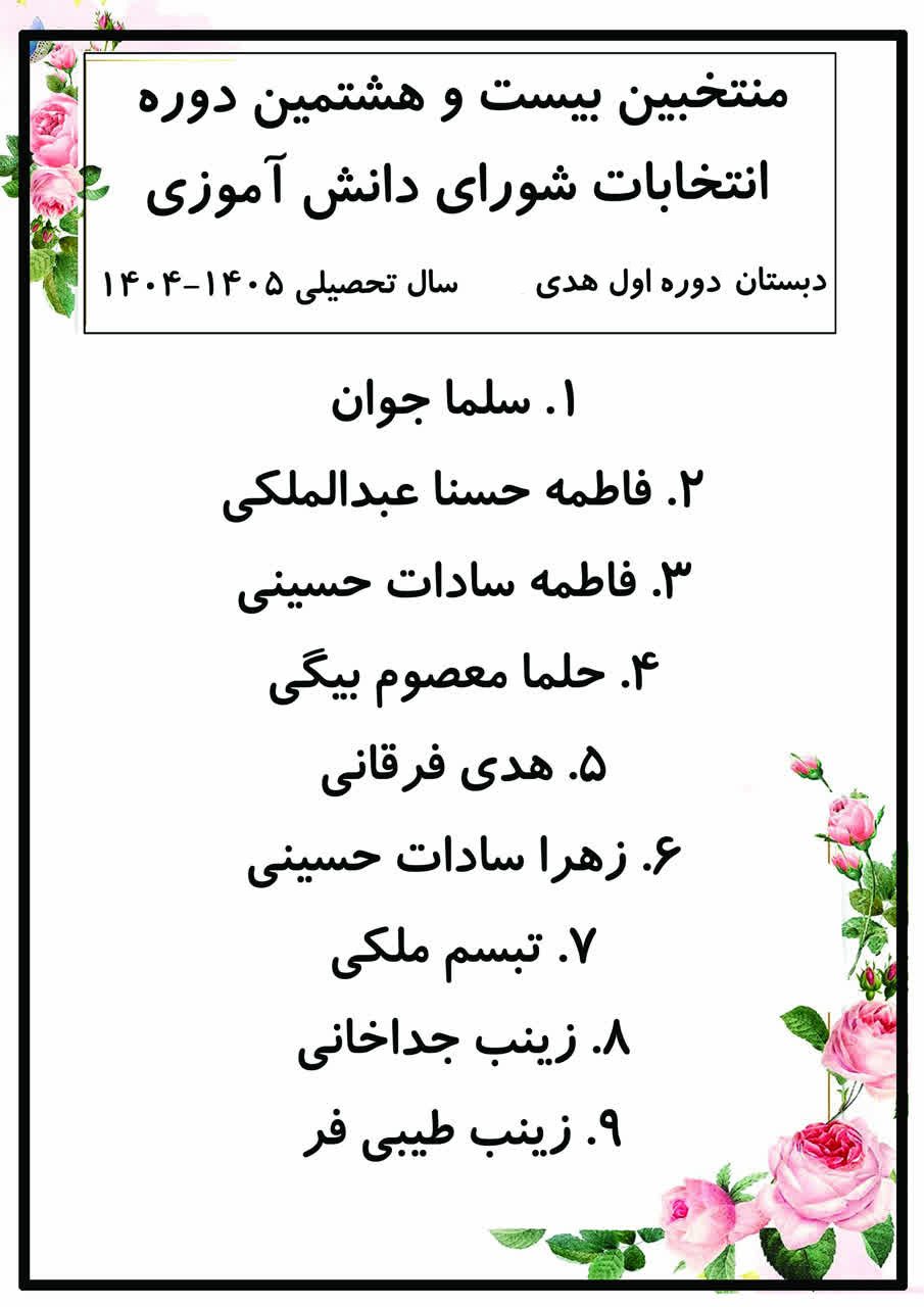 به گزارش خانم ابراهیمی، معاون پرورشی دبستان، پس از برگزاری بیست و هشتمین انتخابات شورای دانشآموزی و شمارش آرا، اسامی منتخبین به شرح زیر اعلام شد: