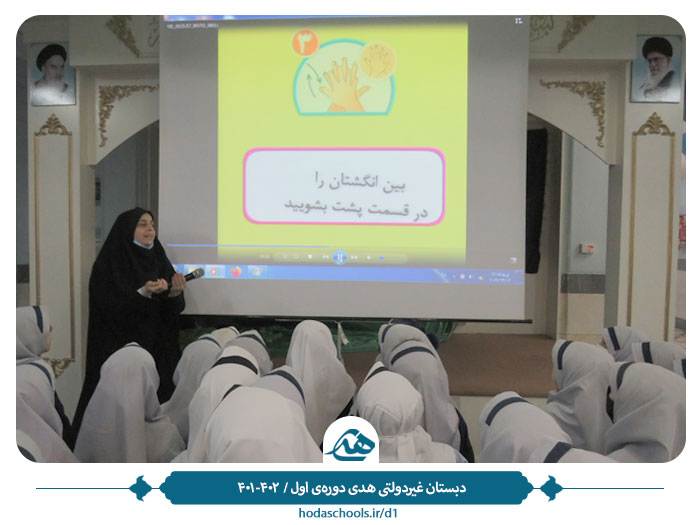 به گزارش واحد بهداشت با توجه به شیوع بیماری در فصل سرما، در برنامهی صبحگاه روز شنبه سوم دیماه، آموزش شستشوی صحیح دستها با اجرای پاورپوینت، برای دانشآموزان توضیح داده شد.