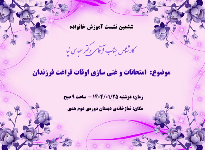 به گزارش واحد خبر دبستان، ششمین نشست آموزش خانواده با موضوع «امتحانات و غنیسازی اوقات فراغت فرزندان» با حضور آقای عباسینیا، روز دوشنبه 25 فروردین ماه ساعت 9 صبح در نمازخانهی دبستان دورهی دوم هدی برگزار میشود.