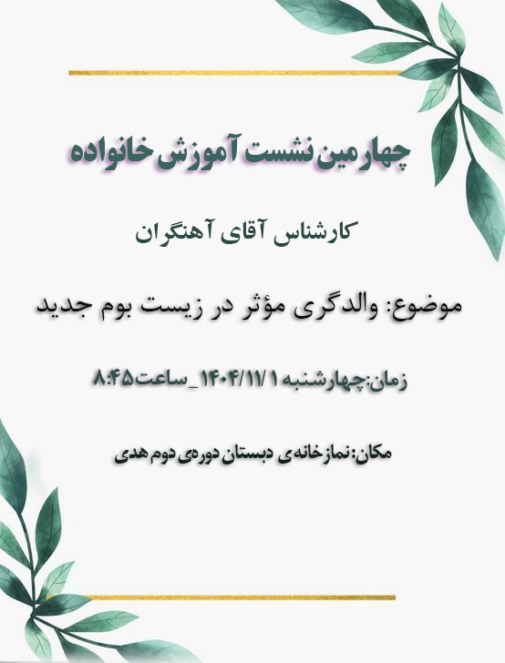 به گزارش واحد خبر دبستان، چهارمین نشست آموزش خانواده با موضوع «والدگری مؤثر در زیست بوم جدید» با حضور آقای آهنگران، روز چهارشنبه 1 بهمن ماه ساعت 8:45 صبح در نمازخانهی دبستان دورهی دوم هدی برگزار میشود.
