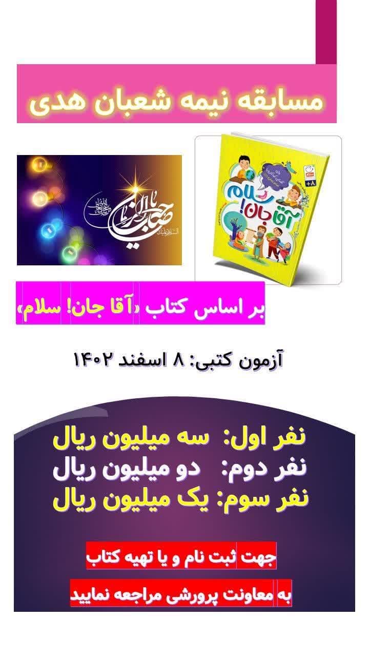 به مناسبت جشن نیمهی شعبان دبستان دورهی دوم هدی مسابقهی کتابخوانی برگزار میکند. این مسابقه به صورت کتبی روز سهشنبه هشتم اسفند ماه از کتاب «آقا جان، سلام» برگزار و به نفرات برتر جوایز نقدی اهدا میگردد.