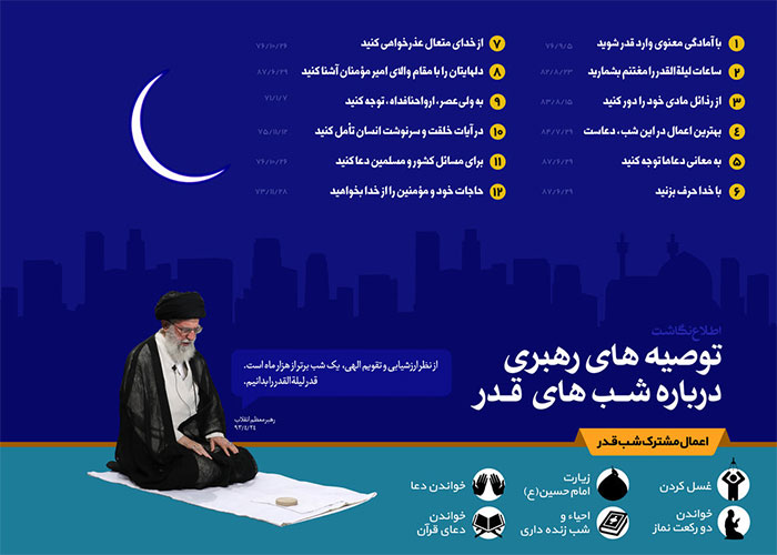 شب قدر برترین و مهمترین شب سال در فرهنگ اسلامیست که به باور مسلمانان، شب نزول قرآن و مقدّر شدن امور یکسالهی انسانها و شب رحمت الهی و آمرزش گناهان است. اطلاع نگاشت زیر توصیههای مقام معظم رهبری -دامت برکاته- است.