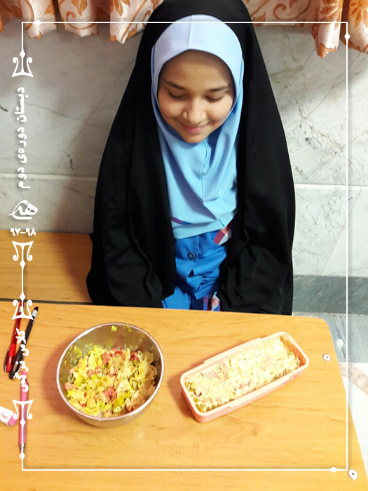 دانشآموزان پایهی پنجم -کلاس پنجم نرگس و نسترن- برای آشنایی با تغییرات شیمیایی و فیزیکی همراه آموزگاران خود خانم باقری و خانم مهرورزان، انواع سالاد را درست کردند.