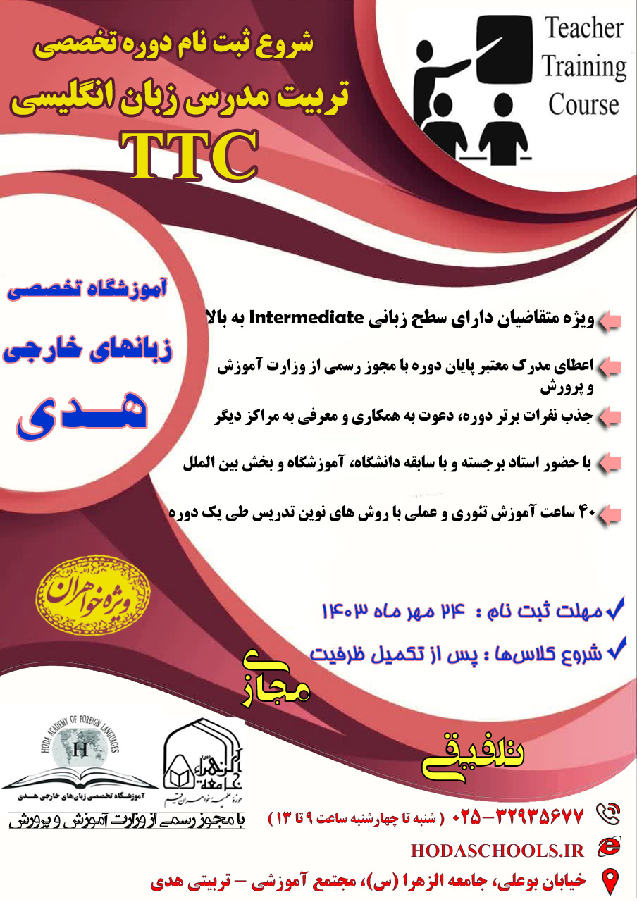 به گزارش روابط عمومی، دوره تخصصی تربیت مدرس زبان انگلیسی (Teacher Training Course) TTC در پاییز 1403 به همت آموزشگاه تخصصی زبانهای خارجی هدی وابسته به جامعة الزهرا(س) برگزار میشود.