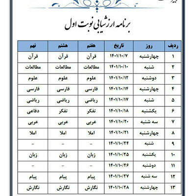 برنامهی ارزشیابی نوبت اول به اطلاع اولیا و دانشآموزان رسید. ...