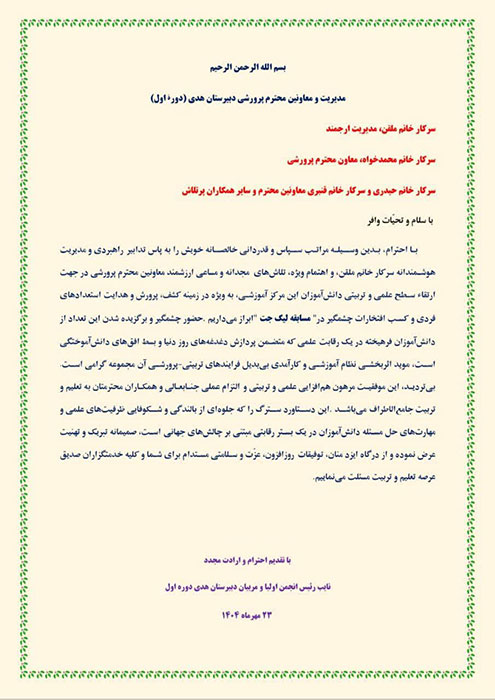 به گزارش واحد خبر مدرسه، اعضای انجمن اولیا و مربیان روز سهشنبه 23 مهرماه 1404 با اهدای تقدیرنامه از زحمات کادر مدرسه قدردانی و تشکر کردند.