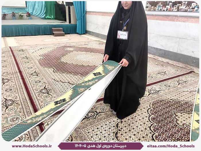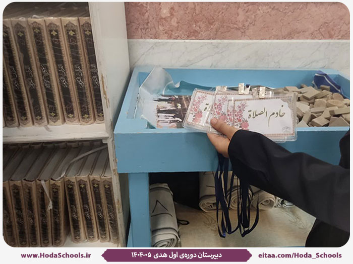 به گزارش خانم قنبری، مربی پرورشی مدرسه، بهمنظور مشارکت معنوی دانشآموزان در اقامهی هر چه باشکوهتر نمازجماعت، چند نفر از دانشآموزان بهعنوان «خادم الصلواه» انتخاب شدند. گفتنی است گذاشتن سجادهی نماز، معطر کردن نمازخانه، و... از وظایف خادمالصلواه میباشد.