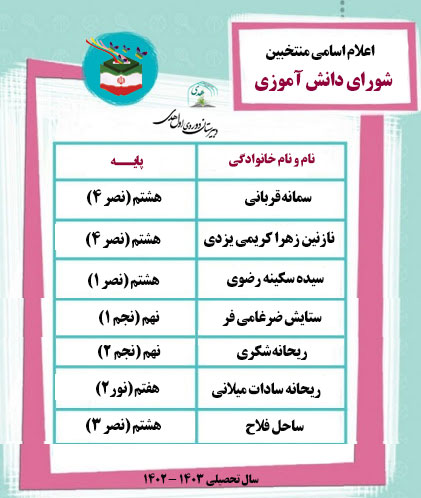 انتخابات شورای دانش آموزی سال تحصیلی 1403_1402 با مشارکت دانشآموزان برگزار شد. پس از اتمام زمان رأی گیری شمارش آرا آغاز و نتایج به شرح زیر اعلام گردید.
