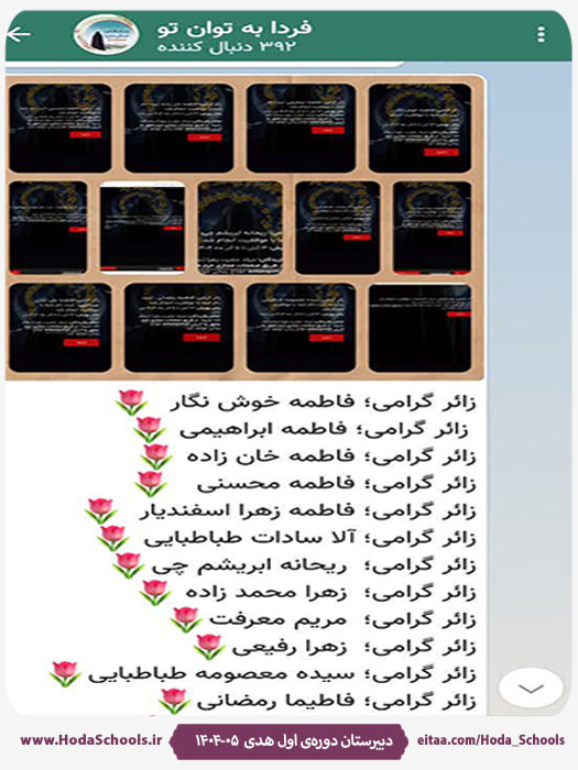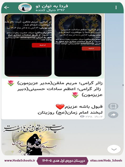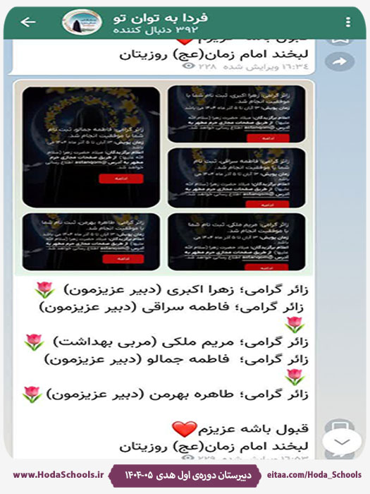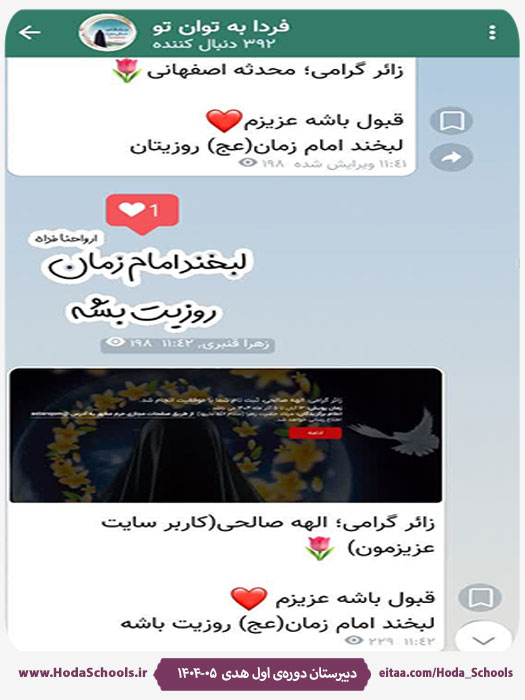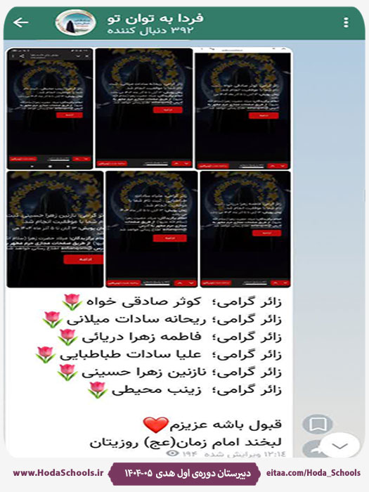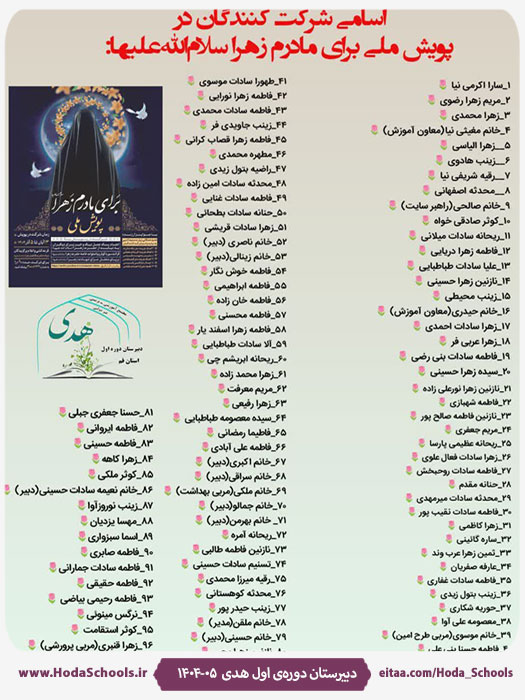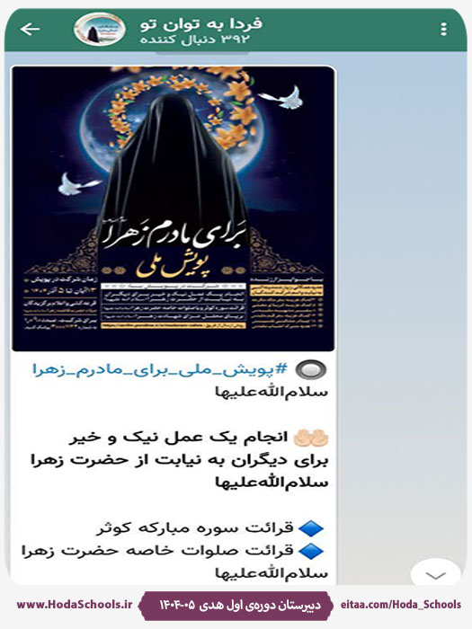 به گزارش خانم قنبری، مربی پرورشی مدرسه، همزمان با ایام فاطمیه، دانشآموزان، دبیران و کادر مدرسه در پویش ملی «برای مادرم زهرا سلاماللهعلیها» شرکت کردند. انجام یک عمل نیک و خیر برای دیگران به نیابت از حضرت زهرا -سلاماللهعلیها-، قرائت سورهی مبارکهی کوثر، قرائت صلوات خاصهی حضرت زهرا -سلاماللهعلیها-، برپایی محفل عزای شهادت حضرت زهرا -سلاماللهعلیها- و کارهای خیر دیگر از جمله اهداف و کارهای انجام شده در این پویش بود.