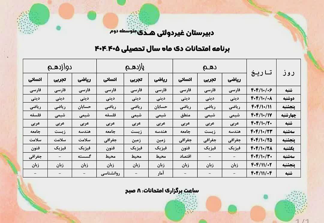 به گزارش خانم رحمانی، معاون آموزشی دبیرستان هدی دورهی دوم، امتحانات نوبت اول از روز شنبه 6 دی 1404، ساعت 8 صبح آغاز میشود و تا 4 بهمن ادامه خواهد یافت.