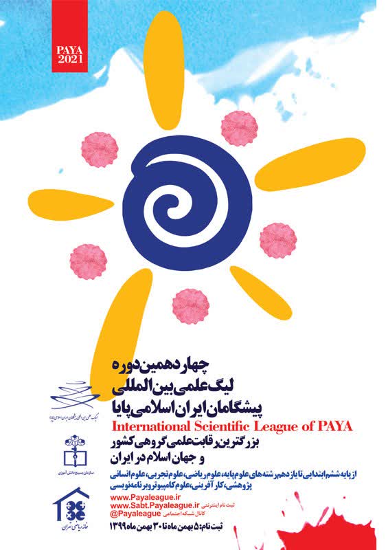 چهاردهمین دوره لیگ علمی بینالمللی پیشگامان ایران اسلامی پایا بزرگترین رقابت علمی گروهی کشور و جهان اسلام در ایران از پایهی ششم ابتدایی تا یازدهم رشتههای علوم پایه، علوم تجربی، علوم ریاضی، علوم انسانی، کارآفرینی، پژوهشی، علوم کامپیوتر و برنامهنویسی سایت: www.payaleague.ir