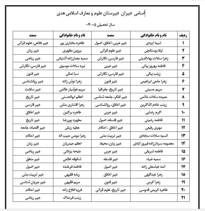 همکاران آموزشی در دبیرستان علوم و معارف اسلامی هدی