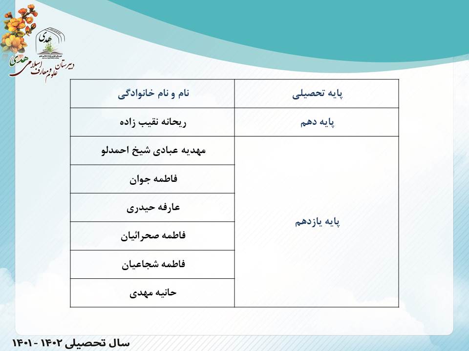 خانم محمدی ناصح معاون آموزشی دبیرستان علوم و معارف اسلامی هدی، ضمن تقدیر و تشکر و آروزی موفقیت برای دانشآموزانی که در المپیاد تخصصی معارف اسلامی شرکت کرده بودند، اسامی نفرات راه یافته به مرحله دوم المپیاد تخصصی معارف اسلامی را به شرح زیر اعلام کردند.