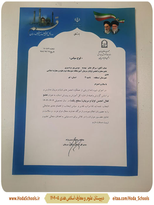 به گزارش خانم سردهی،معاونت پرورشی دبیرستان معارف،انجمن اولیا و مربیان دبیرستان در سال تحصیلی ۱۴۰۴_۱۴۰۳ موفق به کسب رتبهی برتر کشوری گردید.
