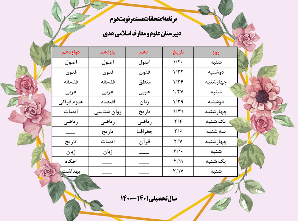 وی افزود: امتحانات مستمر نوبت دوم به صورت حضوری ساعت 7:30 دقیقه در آموزشگاه برگزار خواهد شد که پس از امتحان، کلاسها مانند روزهای گذشته هر 4 زنگ دایر میشود. ایشان برنامه امتحانی را به شرح زیر اعلام کردند.