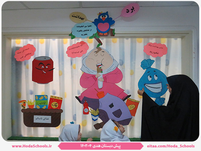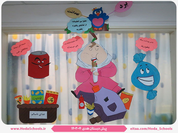 به گزارش مربی بهداشت پیش دبستان، خانم خوش سخن، با توجه به تابلوی اعلانات بهداشت و تغییر ماهانه به همت مربی مربوطه ، تابلوی بهداشتی ماه آبان با موضوع "غذای سالم " طراحی و نصب شد. نوآموزان از طریق قصه گویی و اجرای نمایش، با خوراکیهای سالم و ناسالم آشنا شدند و بصورت آموزش غیرمستقیم، از طرح مدنظر استقبال کردند.