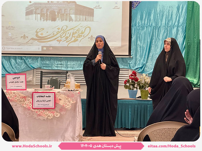 در ادامه، از خانم شهلایی، رییس سابق انجمن و رئیس انجمن دبستان دورهی اول هدی دعوت شد و در مورد فعالیتهای آموزشی و تربیتی (برگزاری جشن آغاز سال تحصیلی و جشن پایان سال، برگزاری اردوها، برگزاری مناسبتهای ملی و مذهبی) مطالبی را مطرح کرد. همچنین در مورد آییننامهی انجمن اولیا و مربیان، نحوهی برگزاری انتخابات، تعیین اعضای جدید انجمن اولیا و مربیان و گزارش عملکرد انجمن اولیا و مربیان سال گذشته صحبت کرد. به علاوه تاکید کرد کسانی که برای انجمن اولیا و مربیان انتخاب میشوند باید فعال و دغدغهمند باشند.