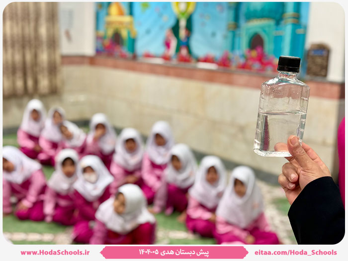 آمادهسازی آب: یک لیوان شفاف را تا حدود سه چهارم حجم آن با آب پر کنید. از کودکان بخواهید به دقت به آب نگاه کنند و بگویید آیا چیزی داخل آن هست یا خیر. (پاسخ مورد انتظار: آب صاف و شفاف است).