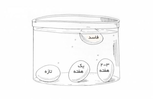 تخم مرغ سالم با عمر "1 هفته" تا کف ظرف در آب فرو میرود اما انتهای پهنش، کمی به بالا متمایل میشود.