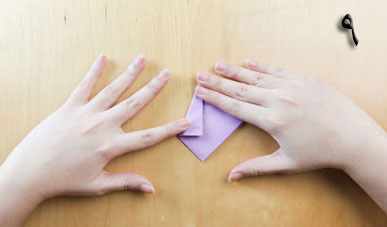 بعد از تاخوردگیها یک مربع به دست میآید که شکل حاصل 4 وجه دارد. که دو وجه آن را شما تا زدید و دو وجه دیگر کاملا صاف و بدون تاخوردگی است کار را باید به روی وجه صاف جلوی رویتان بگذارید. برای این کار مربع حاصل را روی شیار تاخوردگی روی هم قرار دهید.