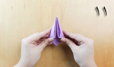 حالا کار را به پشت برگردانید. شما یک تاخوردگی ضربدر شکل و یک علامت به اضافه روی مربع دارید. مثل تصویر سه قسمتی که با فلش مشخص شده است را به داخل تا بزنید. برای این کار کافی است دو نیمهی قطر که کنار هم هستند را روی هم بگذارید تاخوردگی وسط ضلع که در مرحلهی اول ایجاد کردهاید به شما کمک میکند تا این تاخوردگی بهتر حالت بگیرد.